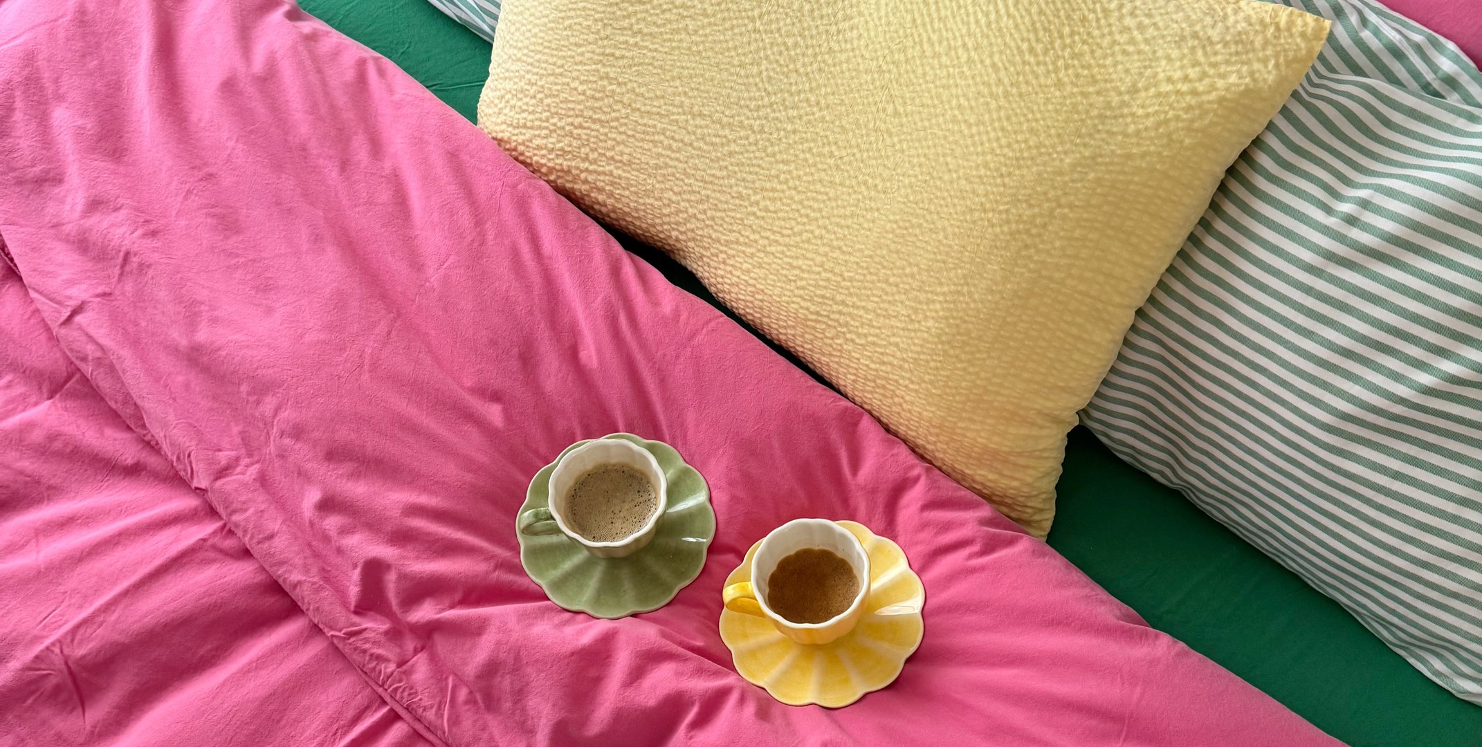 Mitt sengetøy hjemme består 90% av Høie så jeg føler jeg kjenner de ulike type sengetøyene ganske godt. Her har jeg valgt sengetøy ene og alene basert på farger, for man trår sjeldent feil med kvaliteten til Høie uansett. Jeg tror faktisk favoritten min i sommer blir det gule i krepp, fordi krepp er det beste å sove i om sommeren! Men å velge mellom fargene grønn, gul og rosa - det klarer jeg ikke