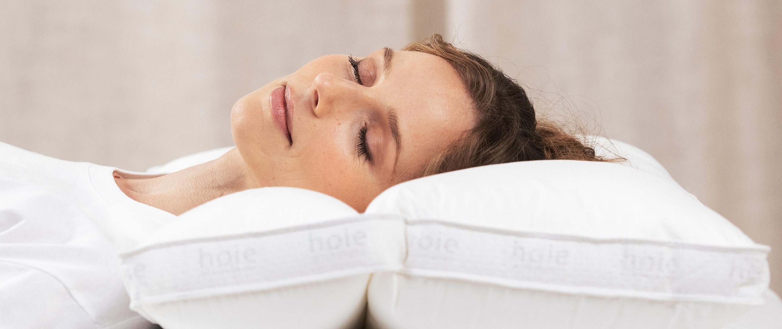 Høie DownFeel Anatomy er en ergonomisk tilpasset pute med to kamre som gir optimal støtte til nakke- og hodepartiet. Nakken hviler på det lille, men faste kammeret og hodet støttes av det større og mykere kammeret.