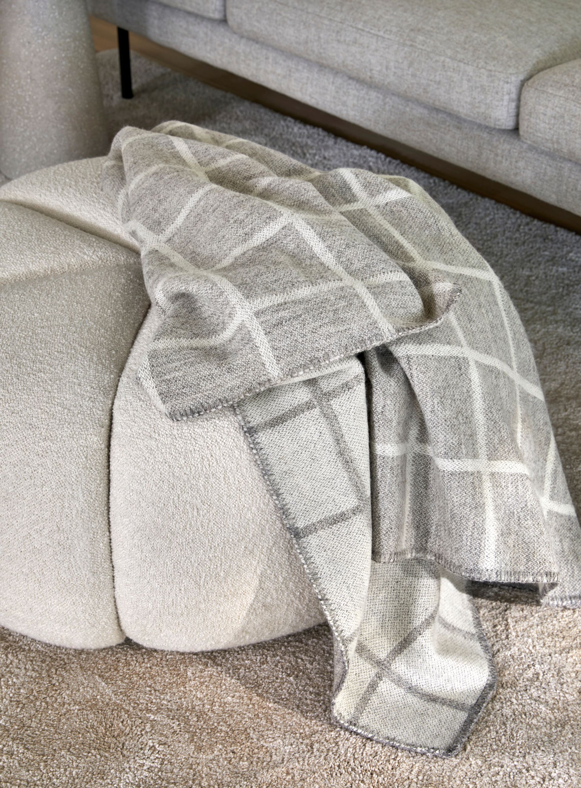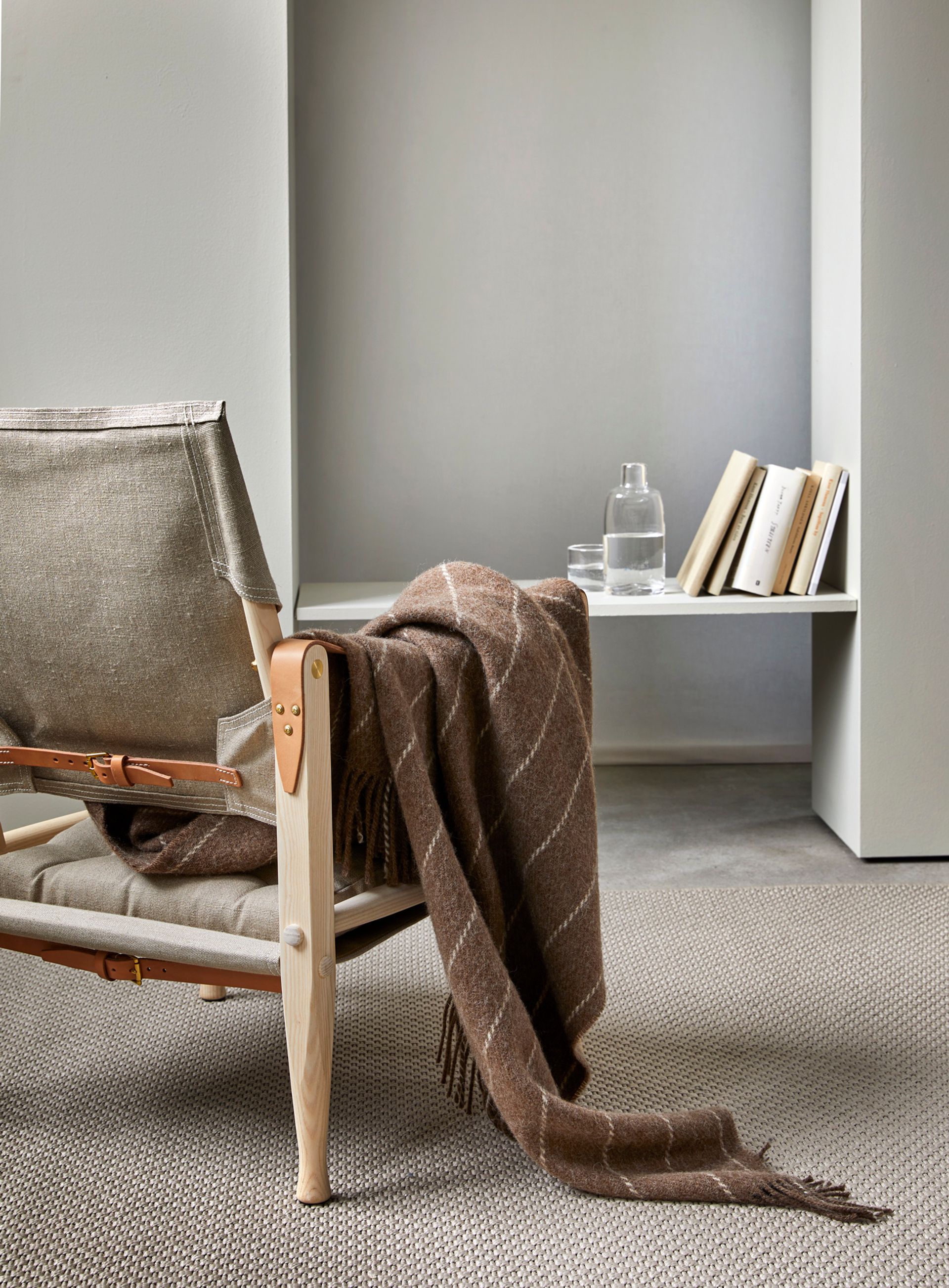 Norsk ull, elegante frynser og naturens egen grå eller brunfarge. I 130x200 cm. har den heldige mottakeren mer enn nok pledd å krype inn under.