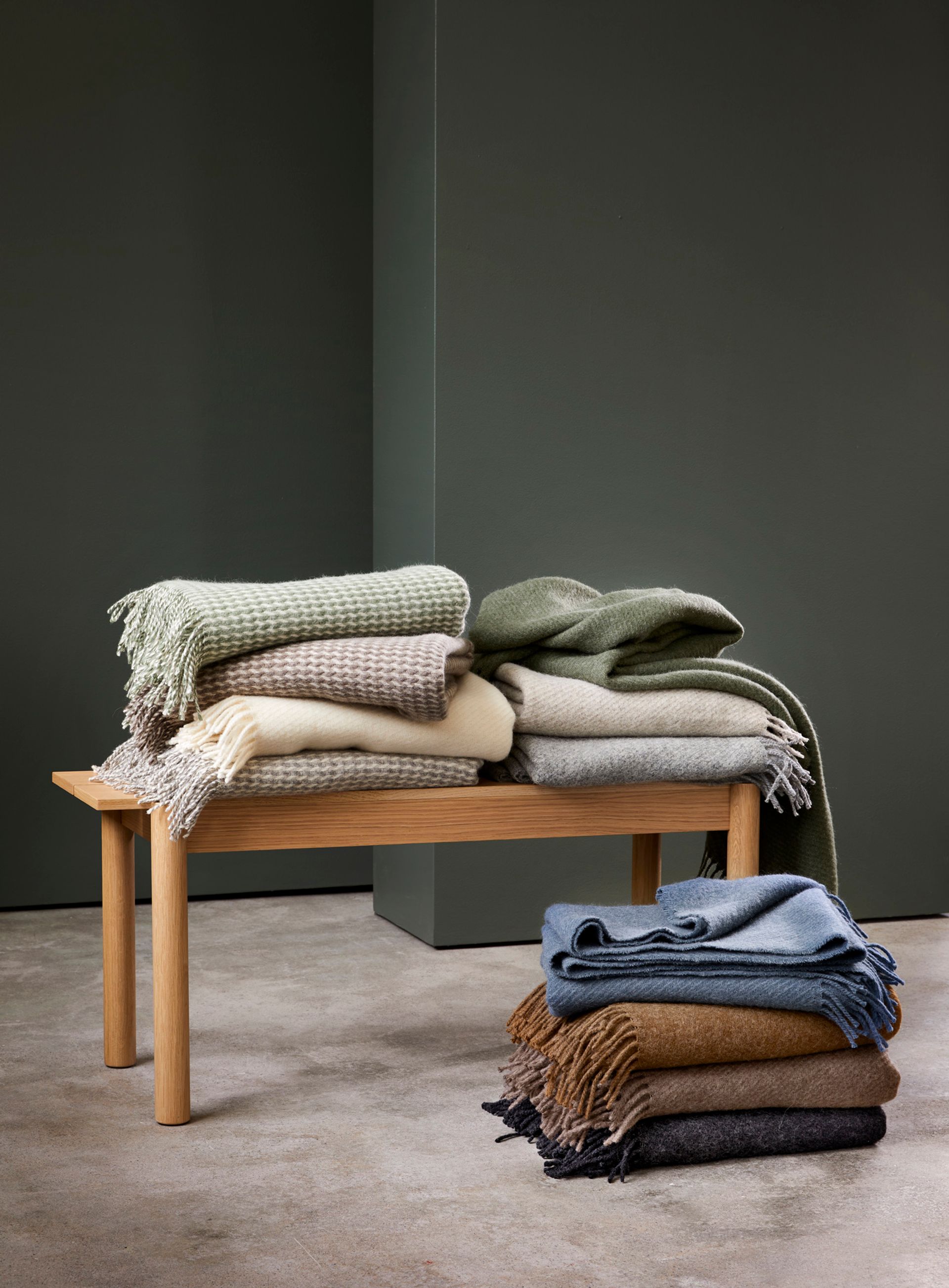 Alle pleddene våre er av 100% ren ull. De er lune, varme og puster godt. Pleddene kommer i både nedtonede og klare farger, og finnes i ensfargede og mønstrede varianter.