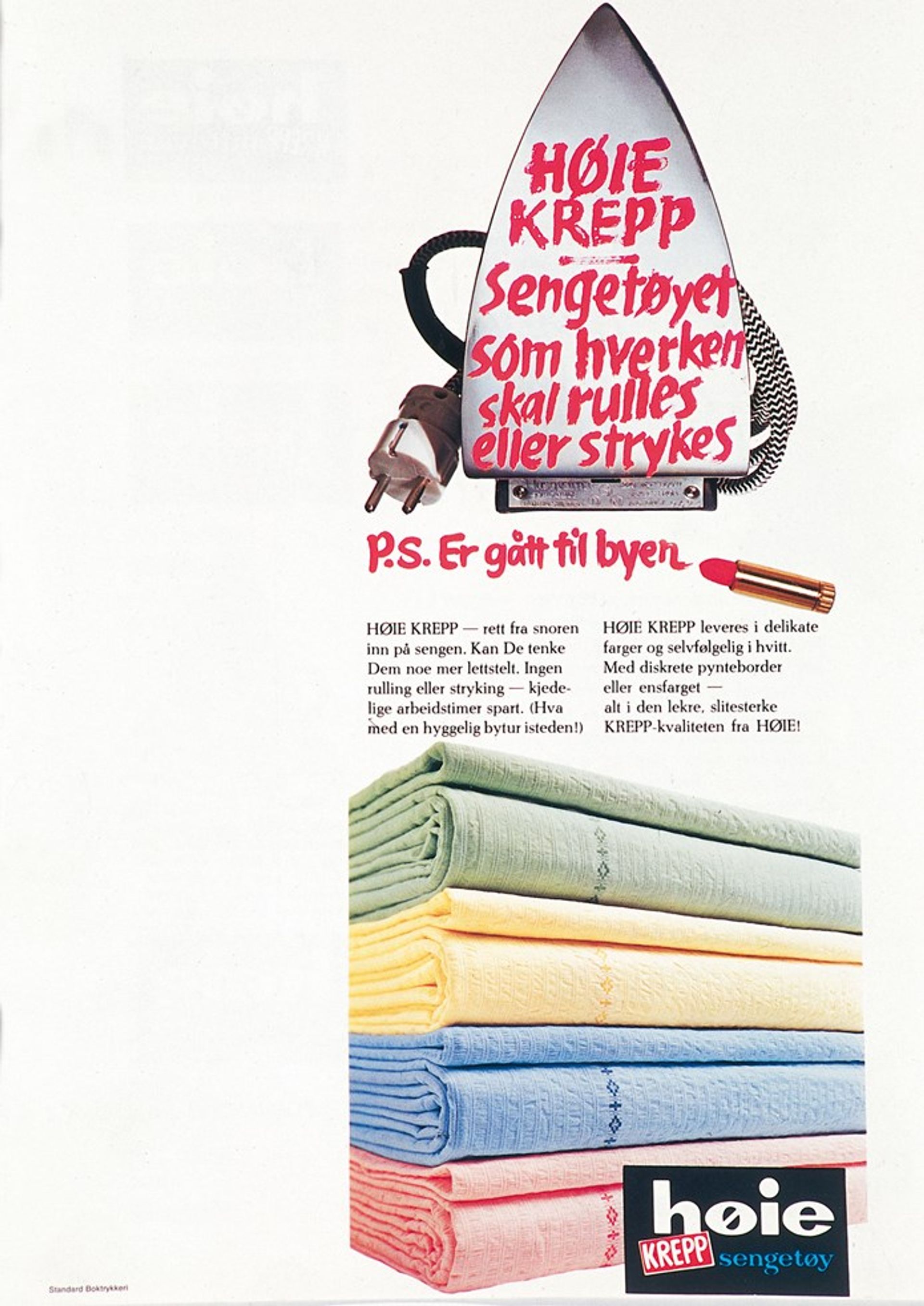 Som første norske bedrift bestemte Høie seg for å satse på ferdig sydd sengetøy samtidig med at de lanserte de første fargede dynetrekk og laken. Dette prosjektet fikk en tung start da husmødrene var vant til å sy alt selv og det kun i ensfarget hvitt stoff, men fabrikken var ustoppelig med sine gjennomarbeidede design og velbegrunnede nyheter og fikk etter hvert et godt fotfeste i markedet. Skepsisen var også stor da kjolestoffet ”Lille Marthine” i krepp ble lansert i 1955 med budskapet om at man slapp rulling og stryking. Men gjennombruddet kom - og innovatøren Høie hadde skapt et unikt begrep som ble kjent langt utenfor Skandinavias grenser. Høie krepp er også kjent i dag som en spesiell veveteknikk som sørger for luftlommer mellom kroppen og sengetøyet noe som gjør at den føles ”lun om vinteren og sval om sommeren”. Og spesielt gøy er det at Høie var først i verden med å lansere krepp på sengetøy. Endelig kunne husfruen ta en tur til byen i istedet.