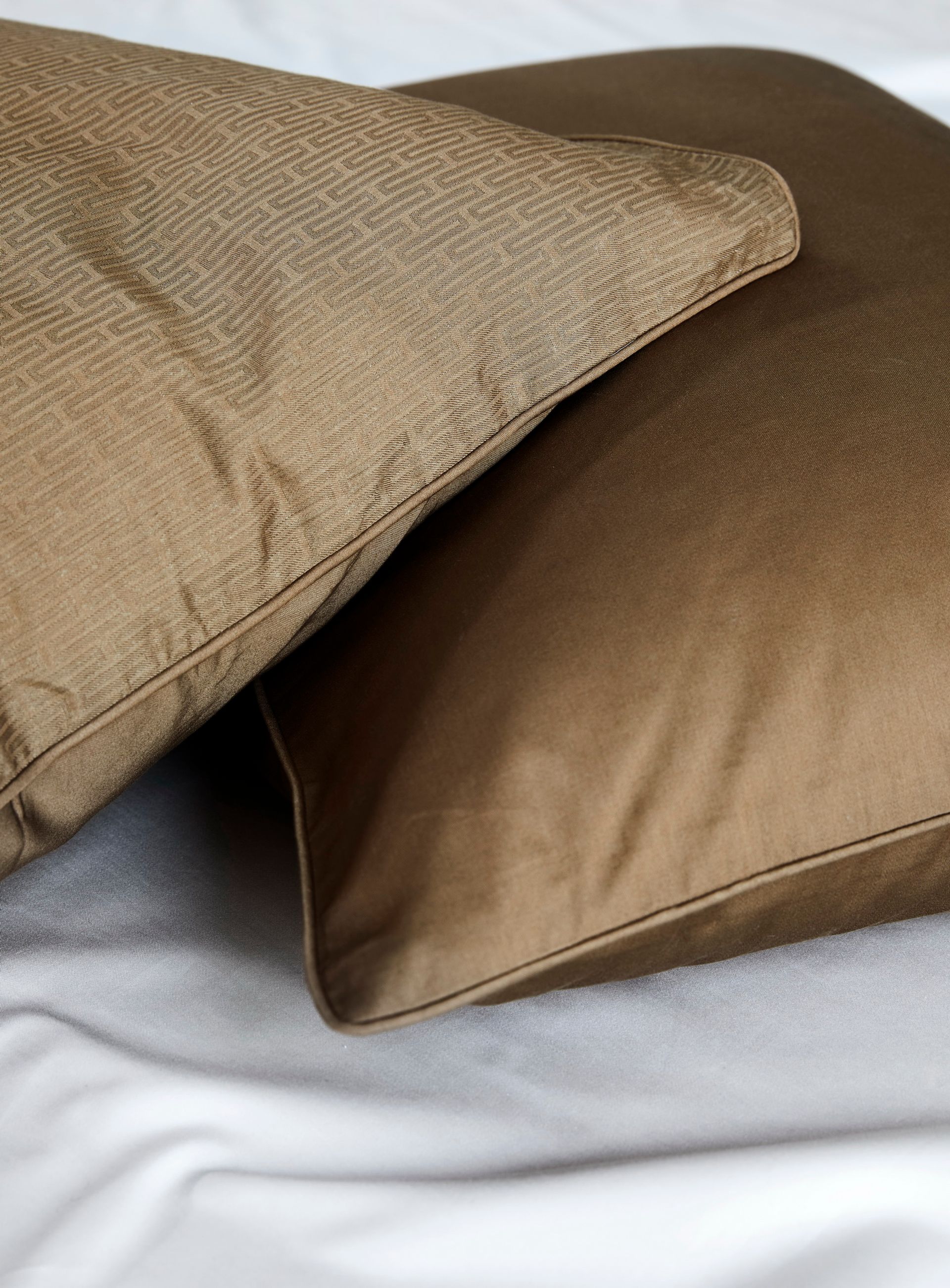 - Stoffene er veldig i fokus, og det er samspillet mellom fargene, mønstrene og materialene som danner uttrykket. For eksempel understreker den eksklusive og skinnende satengen mønsteret på Wessel, som prydes av to ulike mønster på hver sin side. Sengesettet Olai har en lun og varm gyllenbrun farge og er av garnfarget, flanell. En garnfarget flanell er som ingenting annet. Garnfarging betyr at de fine bomullstrådene farges før vevingen, deretter børstes overflaten for å få frem den unike flanellfølelsen. Det gir en himmelsk mykhet som du bare må oppleve.